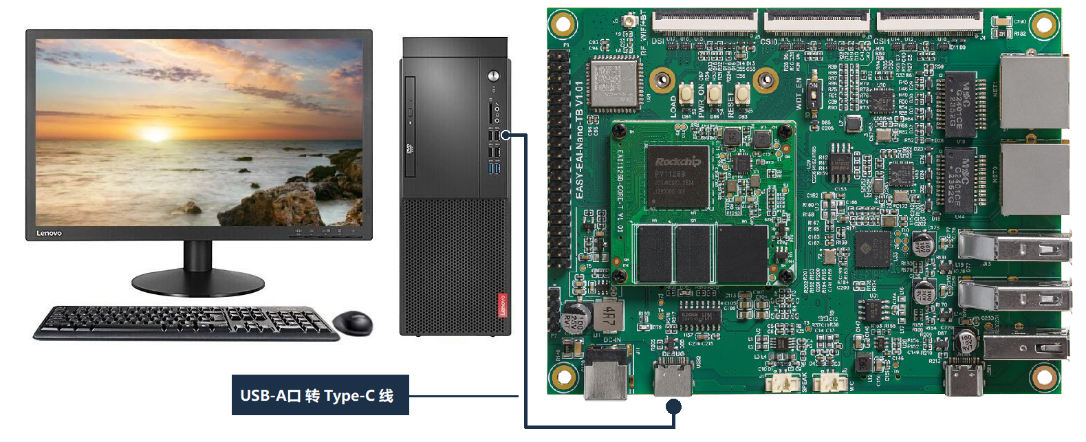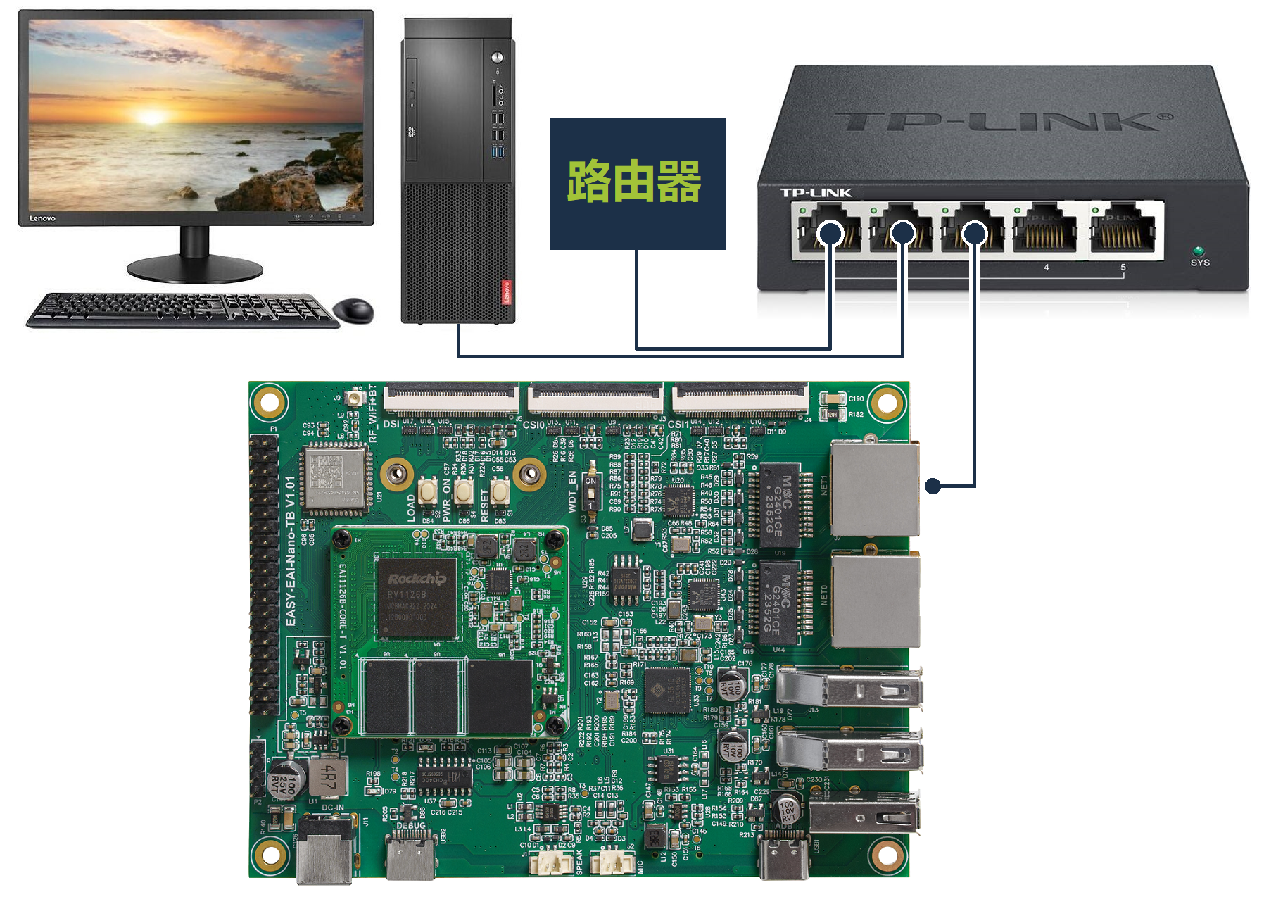 EASY EAI Nano-TB可以基于MobaXterm的ssh远程桌面登录调试。首先使用网线把EASY EAI Nano-TB的千兆以太网接口与连着路由LAN口的交换机或者路由器的LAN口连接,如下图所示。