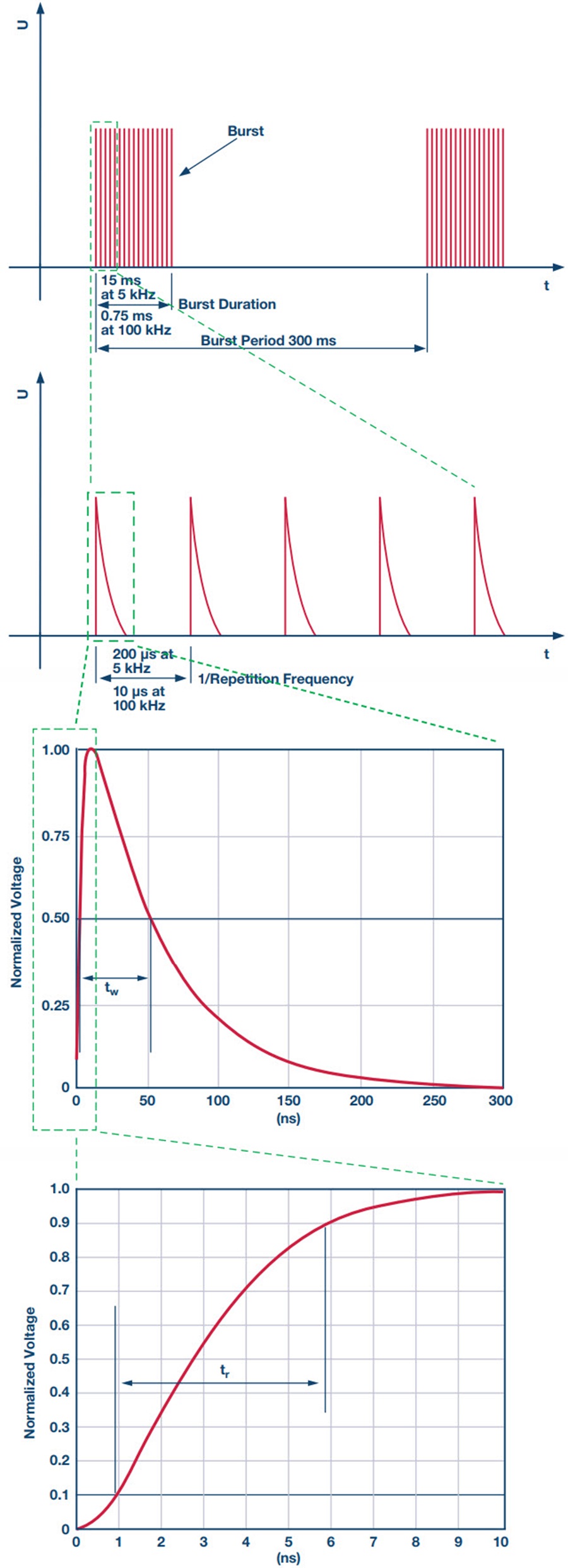 TVS二极管性能良好,可以经受无数次冲击。这对于EFT和浪涌保护非常不错,但是,如果您只需要ESD保护,不妨看看ESD压敏电阻,在达到某个电压值之前,它们都用作高压电阻,达到该电压值之后,它们转变为低压电阻,可以分流掉压敏电阻中的电能。 可采用与TVS二极管相同的配置。它们的泄漏更少,成本不到TVS二极管的一半。请注意,其设计并不要求经受数百次冲击,且其电阻会随着每次冲击下降。ESD压敏电阻也在上述产品上进行了测试,当串联电阻值约为TVS二极管所需值的两倍时,该压敏电阻的性能最佳。 这些产品只在ESD标准下进行过测试。EFT的独特之处在于,虽然电压不高(4 kV及以下),其冲击却是爆发式(5 kHz或以上),上升时间较慢(5 ns)。浪涌每次冲击的能量大约是EFT的1000倍,但速度只有波形的1/1000。如果还需要涵盖这些标准,请确保在这些保护元件的数据手册上表明,它们可以应对这个问题。 |