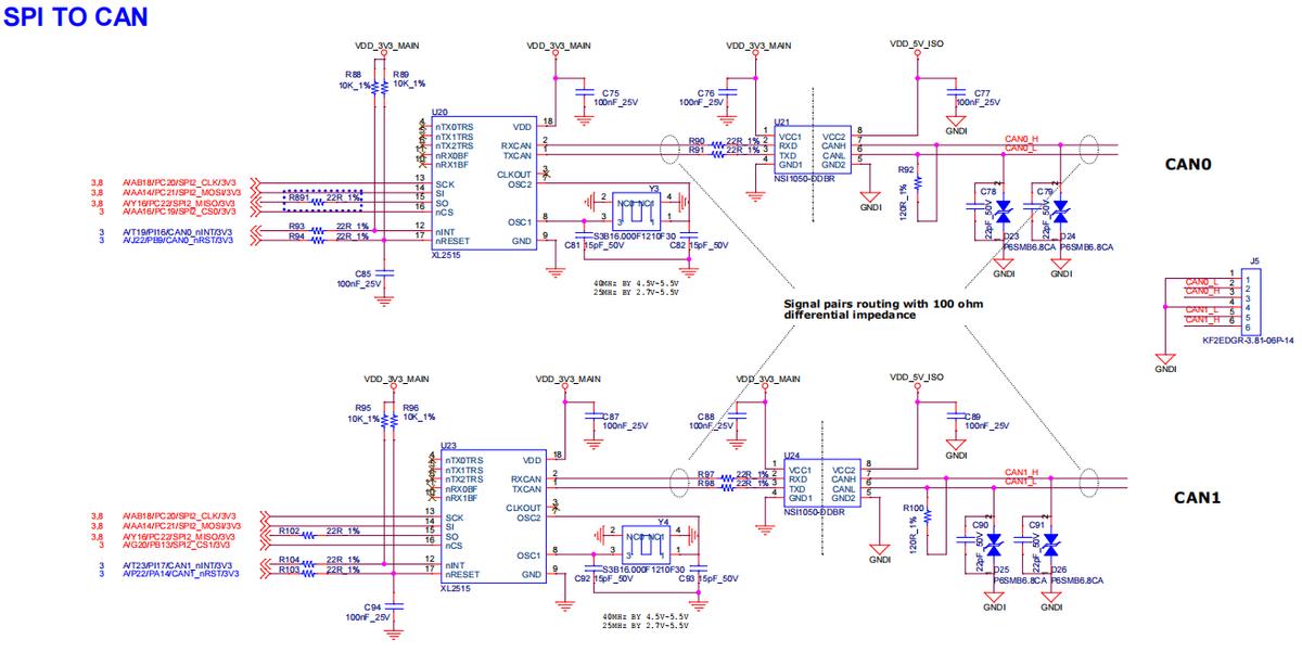J5为通过SPI2总线(2个片选)拓展引出的2路CAN接口,分别为CAN SPI2-1、CAN SPI2-2,均采用6pin 3.81mm绿色端子方式。