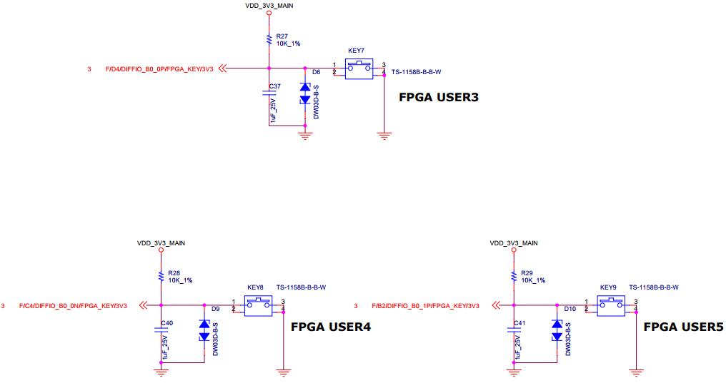- F/D4/DIFFIO_B0_0P/FPGA_KEY/PU/3V3在核心板上已上拉1K电阻至3.3V,该信号引脚为FPGA端IO上电期间的状态配置引脚。当IO_STATUS_C=0,使能内部pullup,当IO_STATUS_C=1,关掉内部pullup。