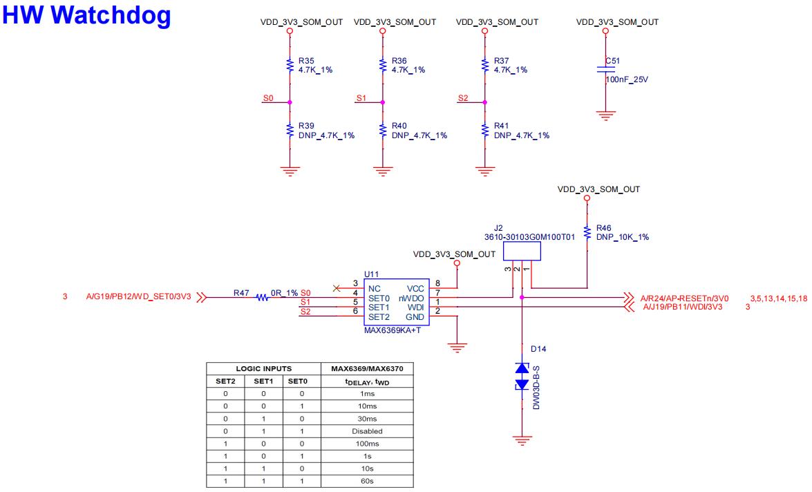 评估底板引出3pin 2.54mm间距排针(J2)作为Watchdog功能配置接口,可通过跳线帽配置使能Watchdog功能。软件上可通过A/G19/PB12/WD_SET0/3V3来控制Watchdog超时时长。