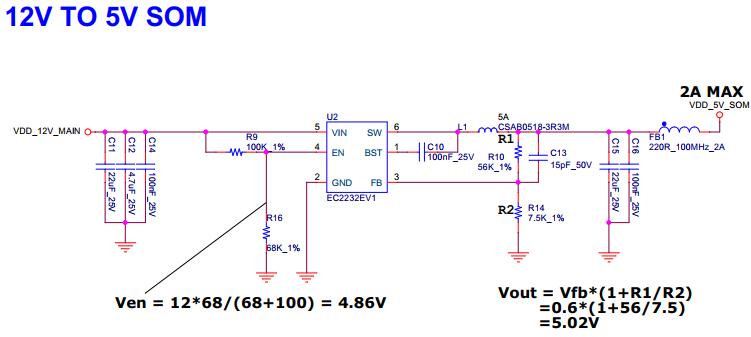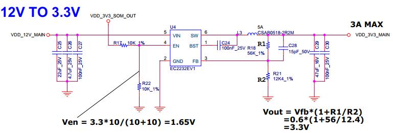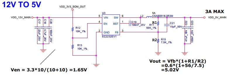 - VDD_12V_MAIN通过EC2232EV1(DC-DC降压芯片)输出VDD_5V_SOM供核心板使用,通过另2路EC2232EV1芯片分别输出VDD_5V_MAIN和VDD_3V3_MAIN供评估底板外设使用。