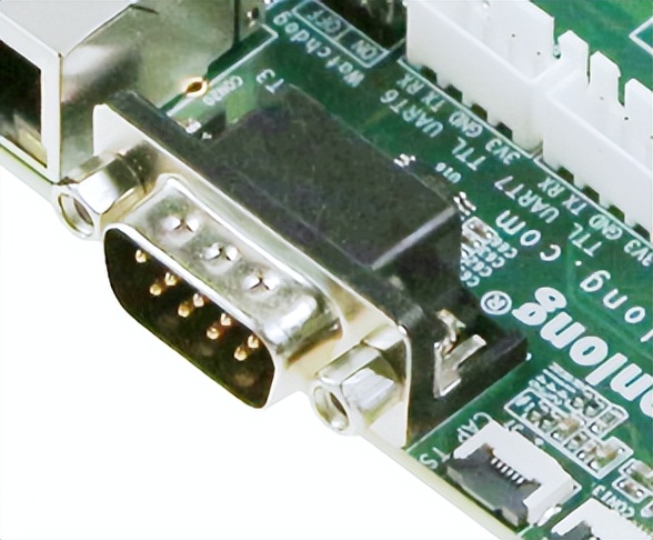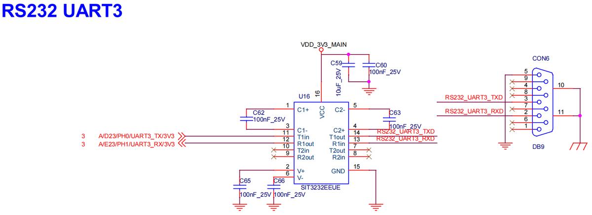 评估板通过SIT3232EEUE串口电平转换芯片将UART3转换为RS232串口,使用9针DB9接口。