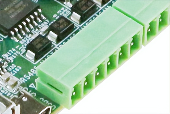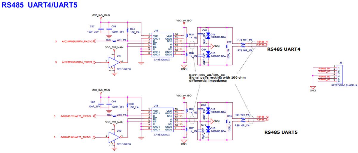 评估板通过2个隔离收发器CA-IS3082WX,将UART4、UART5分别转换为RS485串口,采用6pin 3.81mm绿色端子方式引出。