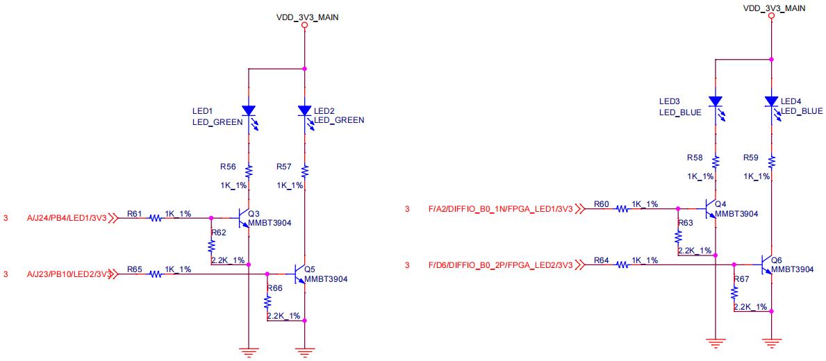 评估底板板载8个LED。LED0为3.3V电源指示灯,上电默认点亮;LED1、LED2为ARM端用户可编程指示灯,通过GPIO控制,默认高电平点亮;LED3、LED4为FPGA端用户可编程指示灯,通过GPIO控制,默认高电平点亮;LED5、LED6为蓝牙模块状态指示灯;LED7为4G模块状态指示灯。