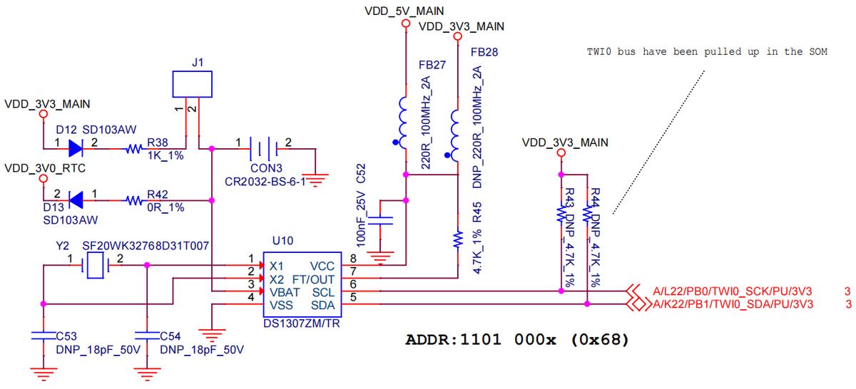 评估底板使用DS1307ZM/TR芯片实现外部RTC功能。CON3为RTC纽扣电池座,适配纽扣电池ML2032(3V可充)、CR2032(3V不可充)。使用可充电电池时,可将跳线帽插入J1接口实现充电。使用不可充电电池时,请勿将跳线帽插入J1接口。
