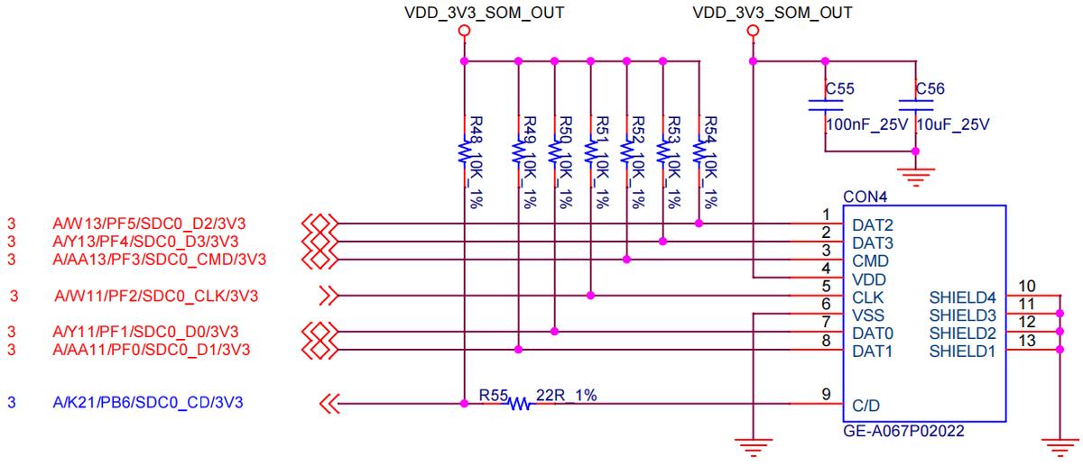 - 建议使用核心板的输出电源VDD_3V3_SOM_OUT给Micro SD(CON4)供电。如使用VDD_3V3_MAIN供电,将可能因该电源存在供电延迟,导致CPU无法正确地读取到Micro SD卡设备而启动失败。