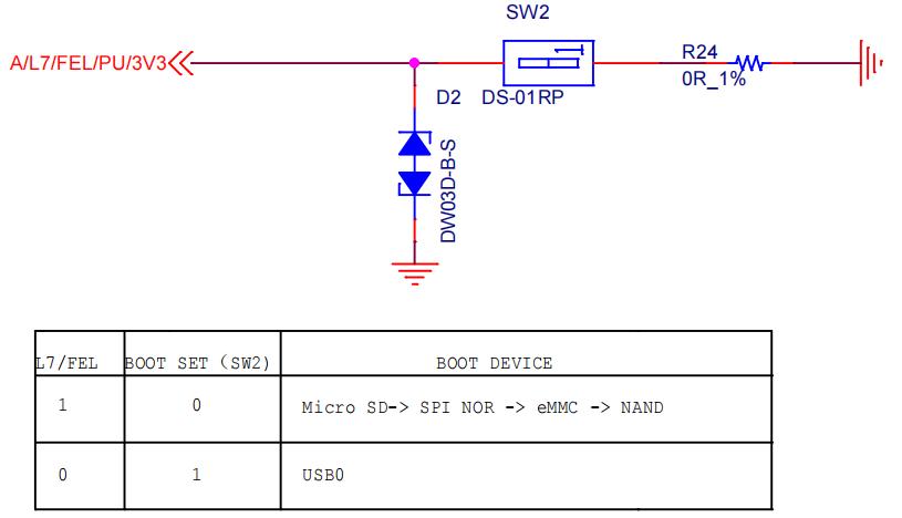- 核心板内部L7/FEL已设计10K上拉电阻,当L7/FEL为高电平(即SW2为0)时,CPU会按顺序检测对应设备并启动系统。