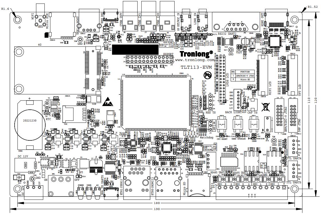 1x RTC座,适配纽扣电池ML2032(3V可充)、CR2032(3V不可充) |