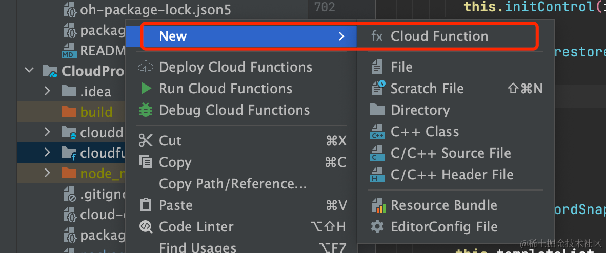 2.比如你要创建一个云函数方法,也是只需在cloudfuntion云函数入口文件点击右键,点击 new,然后你直接创建一个对应的云函数即可。