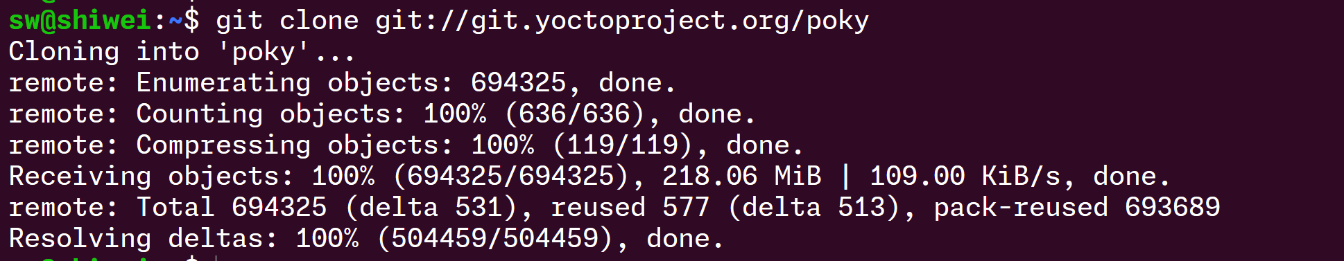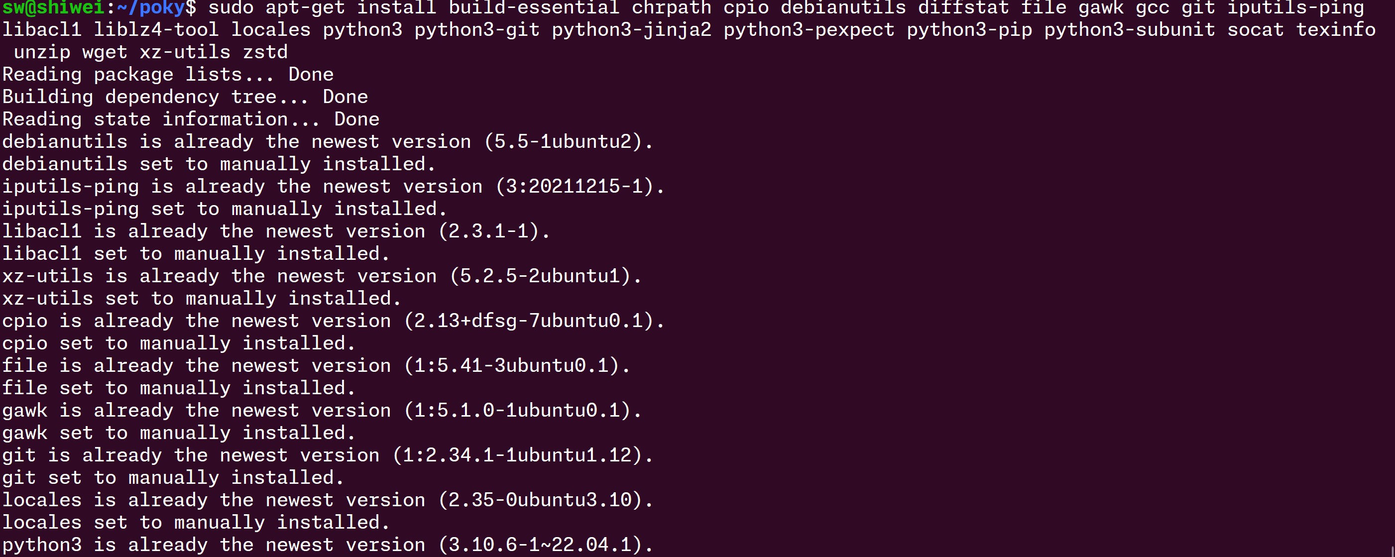 三、 搭建Yocto的构建环境根据书中内容,要搭建Yocto的开发环境,需要准备一个Ubuntu22.04的环境,用虚拟机和WSL都行,这边我习惯使用WSL环境,先安装Ubuntu吧,然后是下载Poky的代码: