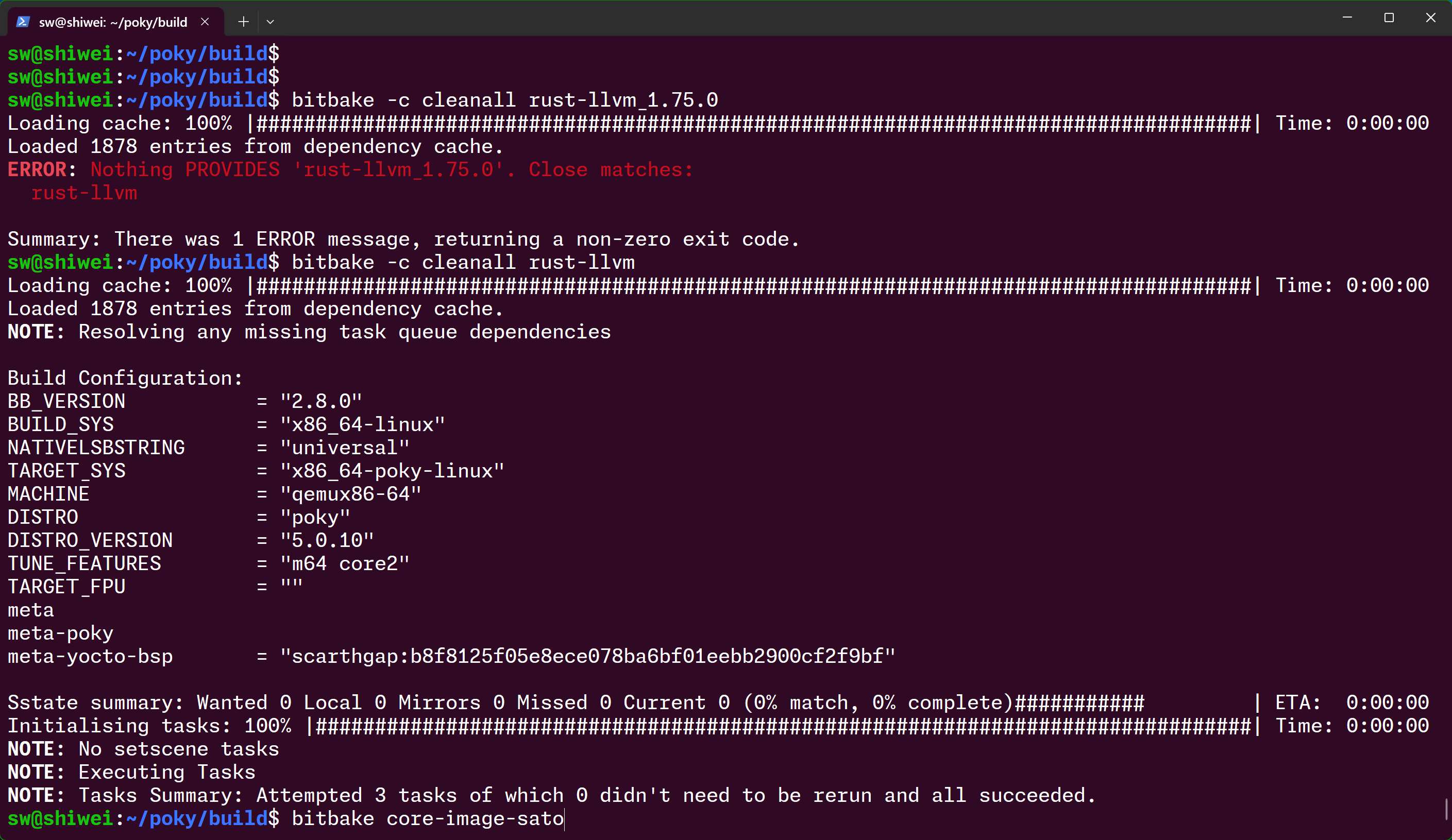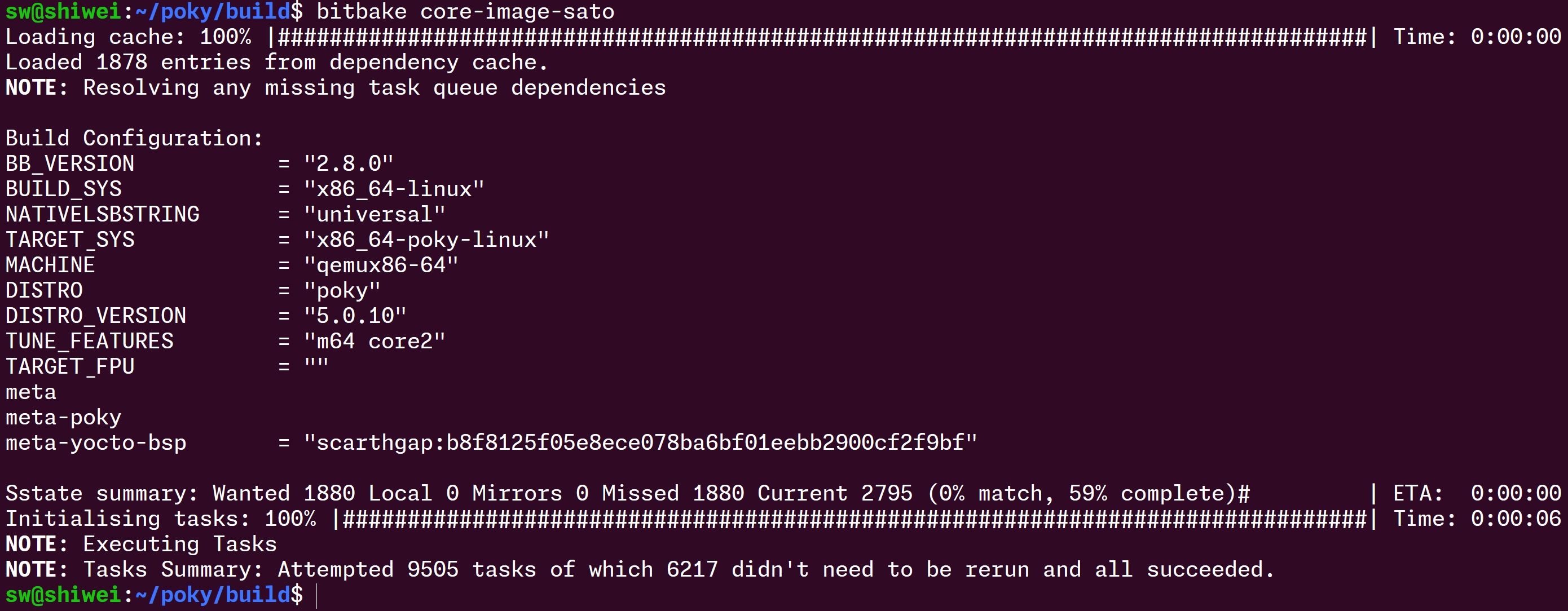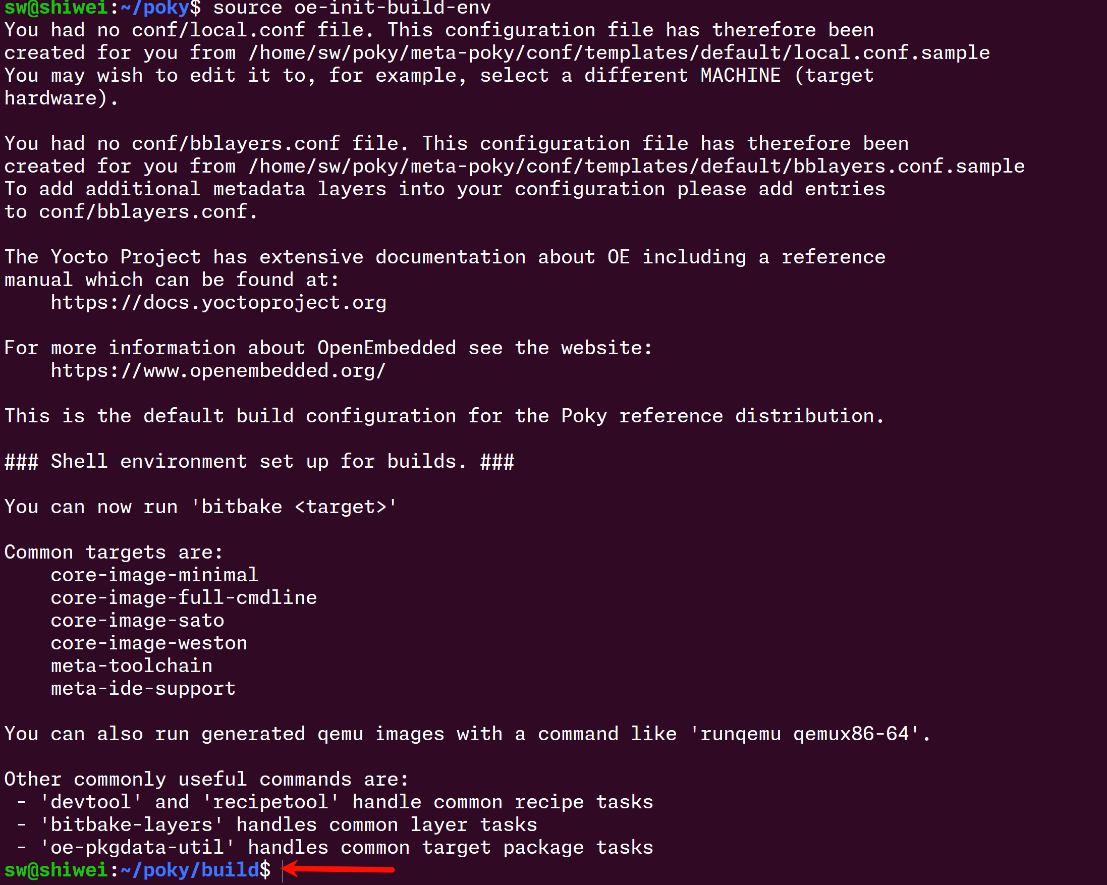 后面就是准备开始构建了,根据书上内容,到最后会有一个qemu的虚拟镜像出来。 先加载环境变量,加载完会切换到build目录: