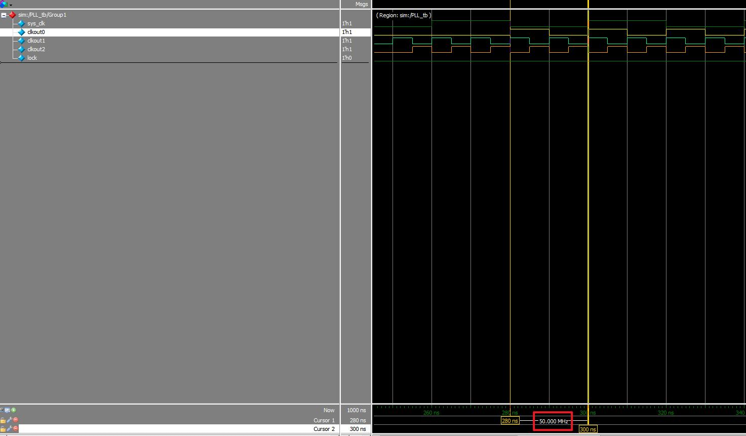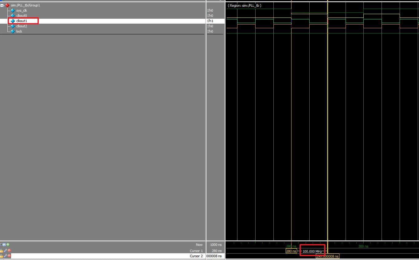 可以看到 clkout1 的时钟频率是 100MHZ,且和 clkout2 相位偏差 180°,符合设置。需要注意 PLL 的输出时钟应该在时钟锁定信号 lock 有效之后才能使用,lock 信号拉高之前输出 的时钟是不确定的。