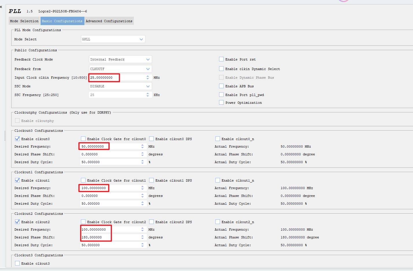 在 Clockout2 Configurations 选项卡下,勾选使能 clkout2,将输出频率设置为 100MHZ,并设置相位偏移为 180 度。