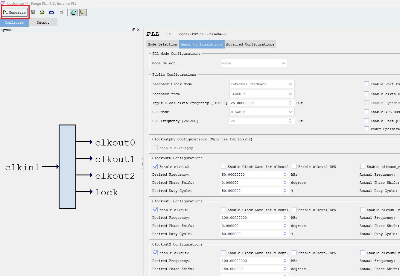PLL 的使用可选择 Basic 和 Advanced 两种模式,Advanced 模式下 PLL 的内部参数配置完全开放,需要自己填写输入分频系数、输出分频系数、占空比、相位、反馈分频系数等才能正确配置。Basic 模式下用户无需关心 PLL 的内部参数配置,只需输入期望的频率值、相位值、占空比等,IP 将自动计算,得到最佳的配置参数。如果没有特殊应用,建议使用 Basic 模式配置 PLL。本次实验我们选择 Basic Configuration。