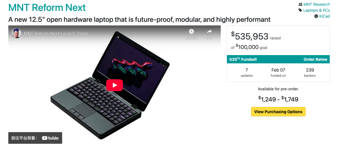 它是2025年最新发布的12.5英寸开源硬件笔记本,自带高性能、强扩展性与高度可维护特性,众筹超额完成(截至目前,MNT Reform Next已筹集超过53.5万美元,远超10万美元目标,获得239位支持者的热情响应),备受全球技术爱好者与开发者推崇。