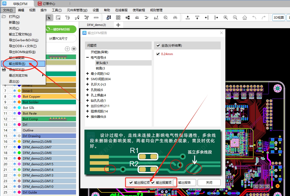 该操作之前,需要 先做“一键DFM分析” ,完成分析后,可制造性分析 报告内容可选择性导出 ,且保存为PDF文档,可用于归档、团队协作或提交问题反馈。