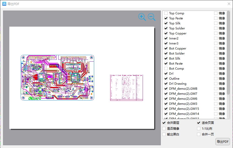 此功能为生产提供所需要使用的每层图纸。输出图纸技巧,可根据需求的输出效果做选择,功能分别为 合并图层、适合页面、是否镜像、1:1比例、输出黑白、合并一页 。根据功能的选择,输出的图纸效果不一样。