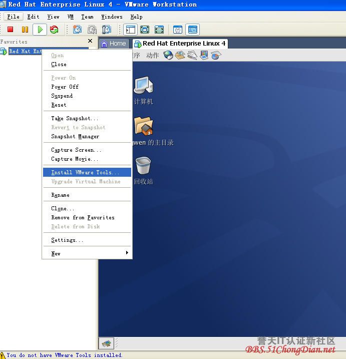 | 我用的是redhzt9.0系统,装Vmware Tools的方法从这篇文章借鉴,非常好用, 如果我们仔细看的话,就会发现在VMware软件界面的左下角处显示着 “you don't have VMware Tools installed”,即我们还没安装VMware Tools。 VMware Tools有什么用呢? VMware Tools其实就是虚拟的显卡的驱动程序,安装以后,虚拟系统屏幕的显示效果会更好 除此之外,我在网上还发现有人说,安装以后,鼠标就可以在主、客系统之间自如地移动,而不需ctrl+alt组合键来切换(这确实有点麻烦)。 当然咯,肯定还有别的用途,才疏学浅哪!接下来就简单介绍一下怎么安装VMware Tools。 1、鼠标右键点击VMware界面左侧中的虚拟系统,选择“Install VMware Tools” 注意:虚拟机必须处在开机状态,关机时无效。如下图: 此时会发现在Linux的桌面上出现一个光盘的图标, 这只是系统将VMware Tools的安装镜像文件加载到了虚拟光驱中, 而并不是真正地安装了VMware Tools。 如下图: 2、找到VMware Tools安装包 右键点击Linux桌面,打开终端,依次输入以下命令(注意有空格): cd /mnt/cdrom(注:进入到虚拟光驱的文件夹里) ls(注:查看文件夹里的文件和子文件夹) 如下图: 这个时候出现的“VMware Tools-5.5.3-34685.tar.gz”即安装包名字, 记住它,稍后将会用到。 3、移动安装包,然后解压安装 在刚刚的终端中,继续输入一下命令: cd /(注:回到根目录) cp /mnt/cdrom/VMwareTools-5.5.3-34685.tar.gz /tmp(注:将安装包复制到tmp文件夹,一定得复制后才能解压,cdrom的文件只有读权限,且不能修改读写权限) cd /tmp(注:进入tmp文件夹里) tar zxf VMwareTools-5.5.3-34685.tar.gz(注:解压安装包) cd vmware-tools-distrib(注:进入解压出来的文件夹里) ./vmware-install.pl(注:执行安装文件) 如下图: 如果你的Linux中已经安装了所有的X窗口环境和开发工具, 上述的安装过程应该比较顺利, 在安装过程中,会遇到诸如“In which directory do you want to install your binary files”这类的问题, 直接按回车就行了; 如遇到诸如带有[yes]的询问时,输入yes后按回车即可。 如下图: 安装完成以后,还会让我们配置分辨率: Do you want to change your guest X resolution? [1]640x480 [2]800x600 [3]1024x768 ... ... 我的机器能支持1280x1024,选择的是7, 自己根据自己机器的情况来决定。 设置分辨率,能使得屏幕在全屏显示下更清晰漂亮 注意,这的分辨率适用于全屏显示, 很多人可能习惯用窗口模式来操作虚拟系统(比如我), 那么就应该把分辨率设置得小些,比如800x600。 至此,VMware Tools就安装成功了, 需要重启一下虚拟机,使配置生效。 #玩转linux |