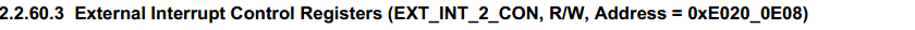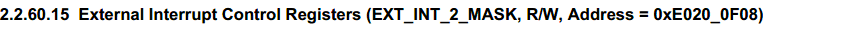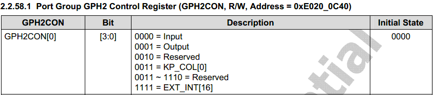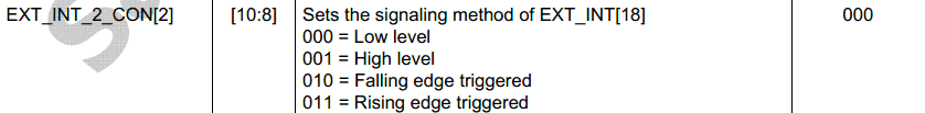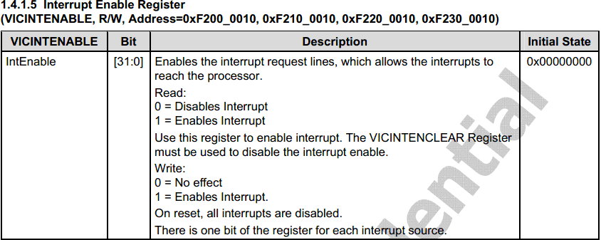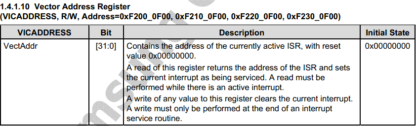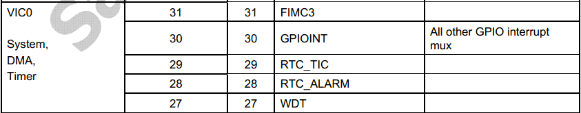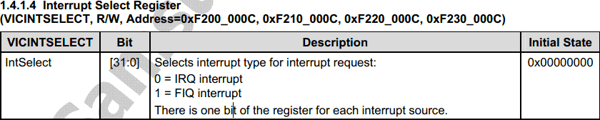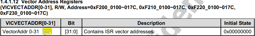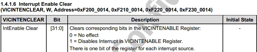 | The interrupt controller in S5PV210 is composed of four Vectored Interrupt Controller (VIC), ARM PrimeCell PL192 and four TrustZone Interrupt Controller (TZIC), SP890. 1.1 KEY FEATURES OF VECTORED INTERRUPT CONTROLLER • Supports 93 vectored IRQ interrupts • Fixed hardware interrupts priority levels • Programmable interrupt priority levels • Supports Hardware interrupt priority level masking • Programmable interrupt priority level masking • Generates IRQ and FIQ • Generates Software interrupt • Test registers • Raw interrupt status • Interrupt request status • Supports Privileged mode for restricted access 1.2 NTERRUPT SOURCE S5PV210中断源分为四组VIC0-3,每组32个中断源(有的缺省)。例如:EINT16_31属于VIC0第16位; 这里以外部中断16为例,下面对各个Register进行配置: EINT16是属于一个GPIO口---GPH2_0,我开发板上GPH2_0 是接的的一个按键,这里就以一个按键按下触发中断为例。首先当然的先配置该GPIO的工作模式进行配置: 这里肯定是选择GPH2CON |= 0xF; //1111---EXT_INT[16] 我们已经配置GPH2_0 工作在中断模式下了,接下就该配置中断的触发方式和是否屏蔽改中断了 外部中断共有四组EXT_INT0-3,其中EXT_INT[16] 就属于EXT_INT2 EXT_INT_2_CON |= 1<<1;// 010 这里选择下降沿触发 EXT_INT_2_MASK &= ~(1<<0);// 0 不屏蔽 EINT16的引脚触发条件我们配置好了,接下就该配置中断寄存器了。 在中断还没配置前需要先关闭中断,关闭中断的寄存器 只需将VICI0INTENCLEAR= 0xffffffff; //关闭所有中断。 接下来就该配置中断了,s5pv210中断分为两种:IRQ interrupt 和 FIQ interrupt,这里选择的是IRQ, 为了省事这里我将VIC0组的中断源全部配置成了IRQ,其实用哪个中断源就配置哪个才是正确滴; VIC0INTSELECT=0x0; //将中断配置成IRQ 中断当然要得有中断处理函数,处理函数的地址被存放在VICADDRESS中: ![]() 在处理函数未被定义时,可先将该寄存器清零,当然复位值就是0,为了保险嘛:VIC0ADDRESS=0x0;//清除中断处理函数的入口地址, 清除后就该定义我们的处理程序了,处理函数名随便取,我们要取的是其地址,定义好后 我们就该把其地址装载到VIC0VECTADDR中 VectorAddr0-31代表这VIC0-3组内的32个中断源的地址,地址是32位占四个字节,所以中断源地址得x4. 例如:EINT16属于VIC0组第16个,EINT16的地址为Address=0xF2000100+16x4 。 (看清楚了哦,清除处理函数地址用的是VICADDRESS寄存器,而装载却用的是VICVECTADDR寄存器,是不同的两个地址) // 保存需要处理的中断的中断处理函数的地址 void intc_setvectaddr(unsigned long intnum, void (*handler)(void)) // void(*handler)(void)---指向函数的指针 { //VIC0 if(intnum<32) { *( (volatile unsigned long *)(VIC0VECTADDR + 4*intnum) ) = (unsigned)handler; } //VIC1 else if(intnum<64) { *( (volatile unsigned long *)(VIC1VECTADDR + 4*(intnum-32)) ) = (unsigned)handler; } //VIC2 else if(intnum<96) { *( (volatile unsigned long *)(VIC2VECTADDR + 4*(intnum-64)) ) = (unsigned)handler; } //VIC3 else { *( (volatile unsigned long *)(VIC3VECTADDR + 4*(intnum-96)) ) = (unsigned)handler; } return; } 处理函数也配置好了,接下来就只剩下开启中断了 ![]() void intc_enable(unsigned long intnum) { unsigned long temp; if(intnum<32) { temp = VIC0INTENABLE; temp |= (1< VIC0INTENABLE = temp; } } 往VIC0INTENABLE 中写1即可,到这里一个EINT16就配置好了。你可以在中断服务函数中实现你想要的功能了, void isr_key(void) //中断处理函数 { printf("we get company:EINT16_31rn"); intc_clearvectaddr(); // clear VIC0ADDR EXT_INT_2_PEND |= 1<<0; // clear pending bit } int main(void) { int c = 0; uart_init();// 初始化串口 system_initexception(); // 中断相关初始化 // 外部中断相关的设置 GPH2CON |= 0xF; // 1111 = EXT_INT[16] EXT_INT_2_CON |= 1<<1; // 010 = Falling edge triggered EXT_INT_2_MASK &= ~(1<<0); // unmasked intc_setvectaddr(NUM_EINT16_31, isr_key); // 设置中断EINT16_31的处理函数 intc_enable(NUM_EINT16_31);// 使能中断EINT16_31 while (1) { printf("%drn",c++); delay(0x100000); } } |