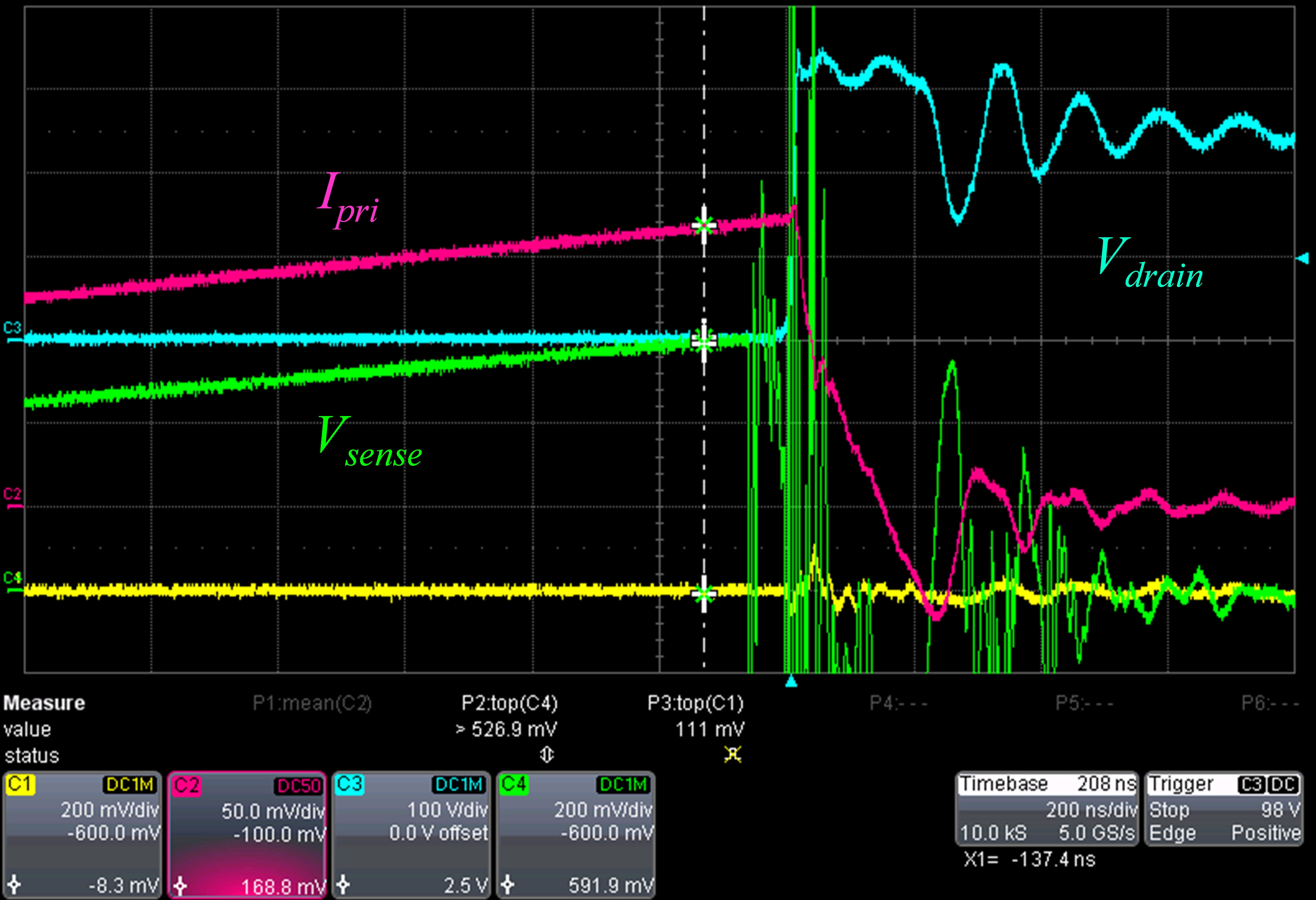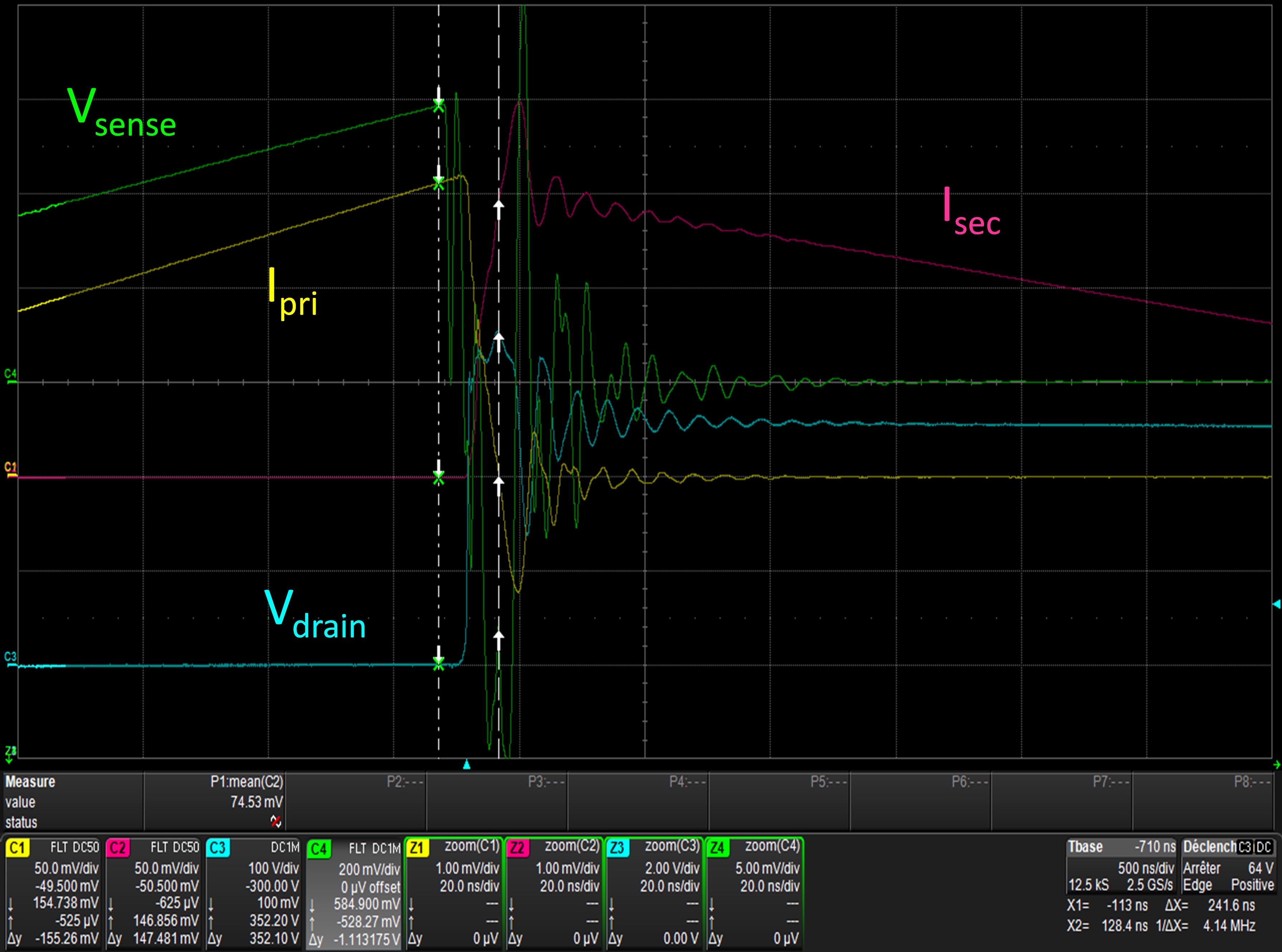 在所测得的初级电流和由检测电阻转换的电流图像之间有约100毫安的差异。如果我们考虑由控制器测量的检测电压方面的问题,1.547 A的初级电流应该提供一个检测电压: