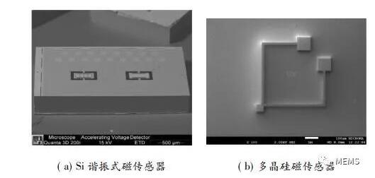 体微加工工艺是采用湿法和干法蚀刻技术,通过材料的各向同性和各向异性蚀刻制备所需要的材料结构。表面微加工工艺是通过在衬底上进行不同材料层的沉积,图案化和蚀刻实现对MEMS器件的制造。通常,这些层被用作结构和牺牲层。图1分别给出了通过体加工和表面微加工工艺制备的磁传感器的SEM。