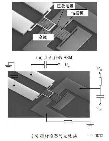 图2 压阻式MEMS磁传感器主元件的SEM和电连接