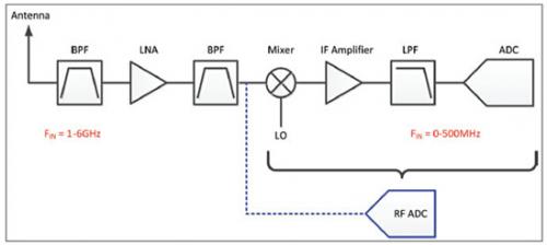 目前诸如ADC12J4000的RF采样ADC可以大大提高超宽波段接收器的使用和性能。其高输入带宽在RF上直接实现了信号的数字化,与此同时,快速采样率又降低了滤波器要求,并实现了带内干扰器谐波周围的频率规划。通过添加片上数字滤波器来大大降低数字接口数据流量,从而使ADC12J4000成为小型、低功耗、下一代数字无线电的完美选择。