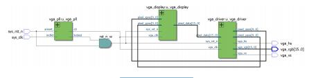 VGA驱动模块产生行场同步信号及像素点的纵横坐标,VGA显示模块输出图像数据。