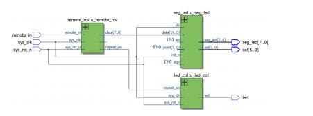 FPGA顶层(top_remote_rcv)例化了以下两个模块:红外驱动模块(remote_rcv)和数码