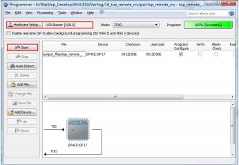 当前的硬件连接为“USB-Blaster”。然后点击“Start”将工程编译完成后得到的sof文件下