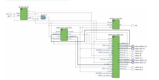 SDRAM控制器顶层模块主要完成SDRAM控制器及SDRAM读写端口FIFO控制模块的例化。代码