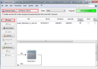 “USB-Blaster[USB-0]”。然后点击“Start”将工程编译完成后得到的sof文件下载到开发板