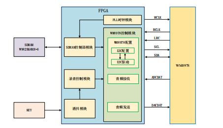 制及数据信号的交互。PLL时钟模块分别为WM8978音频芯片提供主时钟,为SDRAM控制器模块提