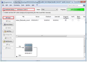 “USB-Blaster[USB-0]”。然后点击“Start”将工程编译完成后得到的sof文件下载到开发板