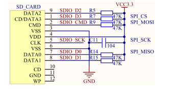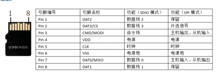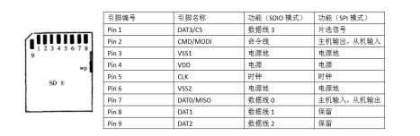 SD卡共有9个引脚线,可工作在SDIO模式或者SPI模式。在SDIO模式下,共用到CLK、CMD、
