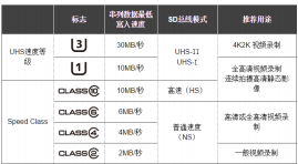 速度等级划分为UHS速度等级1和3。不同等级的读写速度和应用如下图所示。