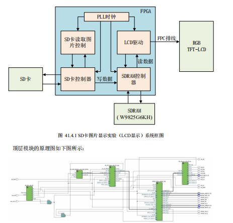 FPGA顶层模块(top_sd_photo_lcd)例化了以下五个模块:PLL时钟模块(pll_clk)、SD