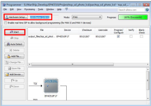 “USB-Blaster[USB-0]”。然后点击“Start”将工程编译完成后得到的sof文件下载到开发板