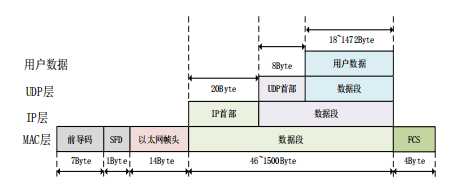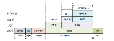 下图为以太网通过UDP(User Datagram Protocol,用户数据报协议)传输单包数据的格式,