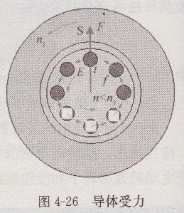 电动机定子接三相电源后,电动汽车电机内便形成圆形旋转磁动势,圆形旋转磁密,设其方向为逆时针转。若转子不转,转子鼠笼导条与旋转磁密有相对运动,导条中有感应电动势E,方向由右手定则确定。由于转子导条彼此在端部短路,于是导条中有电流,不考虑电动势与电流的相位差时,电流方向同电动势方向。这样,导条就在磁场中受力f,用左手定则确定受力方向,如图4-26所示。