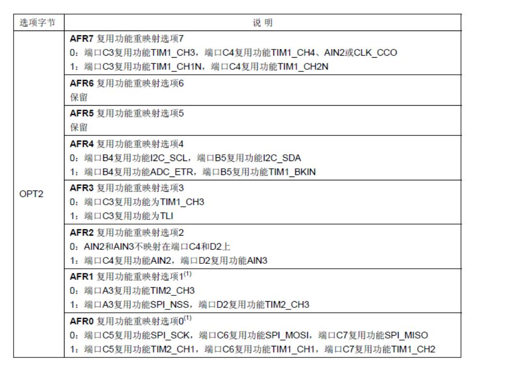 stm8s的pwm功能可由其高级定时器TIM1配置输出。TIM1有四个输出通道,我们选择其中一路TIM1-CH4,默认情况下,其对应的CPU端口在PC4,如图2 AFR7位。