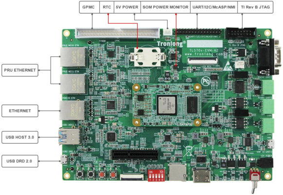 ti Sitara系列AM5708 ARM Cortex-A15 +浮点DSP C66x处理器设计的异构多核SoC评估板,由核心板和底板组成。核心板经过专业的