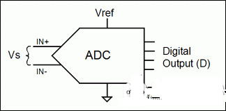 用于将传感器信号数字化的 ADC 也是比例器件。无论其内部架构如何,所有 ADC 都是通过对未知输入电压与已知参考电压相比较来工作的。转换器的数字化输出是输入电压与参考电压的比值乘以 ADC 的满量程读数。考虑到内部放大和设计的多样性,还需要一个比例因子 K。无论 K 值大小,只要 ADC 的配置未改变,K 值都保持固定不变。公式 4 描述了一个普遍意义上的 ADC (图 2)的数字读数(D)和输入信号(Vs),参考电压(Vref),满量程读数(FS)以及比例因子(K)间的关系。