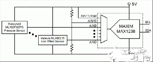 图 3 中 MAX1238 的前端有一个 12 输入的多路复用器,且内置一个电压基准。在这种情况下,虽没有与 ADC 基准有关的附加成本,但是如要给 10 个传感器中的每个都增加基准则会使成本明显增加。 MAX1238 还允许 AN11 输入作为参考电压。将 AN11 作为参考输入并将其连接至 5V 电源,可设置 ADC 的满量程输入为 5V,并便于与比例型传感器配合使用。在图 3 中,MAX1238 的内部参考电压并非闲置。可用软件控制内部电压基准并用于诊断,如测量电源电压。可通过连接到输入 AN10 的分压器来实现。