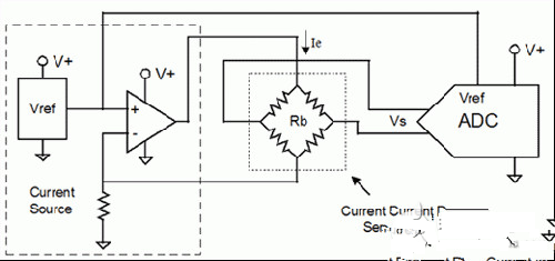 图 4 给出了一个常用于桥式输出传感器的电流源。该电流源由一个低温度系数电阻,一个运算放大器及一个电压基准组成。如果 ADC 和压力传感器整合于一个部件中,则电流源的电压基准也可为 ADC 提供参考电压。在图 4 的电路中,电压基准同时被用来稳定传感器和 ADC,使它们不受变化的温度和电源电压的影响。