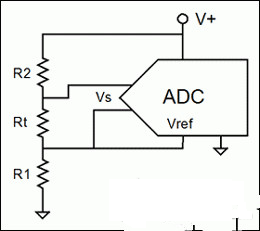 由公式 14 可以看出,R2 不影响读数;R2 降低了 Rt 所消耗的功率。如果没有 R2 的话,Rt 的自身热量将导致温度示数出现很大误差。R2 还降低了 ADC 的共模输入电压。这对某些共模输入电压范围小于电源电压的 ADC 是非常必要的。