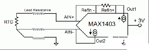 图 7. MAX1403 ADC 有两个匹配的电流源,在该电路中,电流源 1 用于产生 RTD 两端的压降,电流源 2 用于产生中间导线的压降。