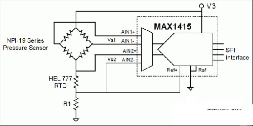 图 8 结合了图 5 和图 6 中的设计理念,采用一个很简单的电路,以单个电阻作为基准同时测量温度和压力。Vs1 和 Vs2 的幅值相差很大。这个差值可通过改变 ADC (例如 MAX1415)内置可编程增益放大器(PGA)的增益进行调节。这些转换器允许 PGA 对每个通道都设置不同的增益。增益的改变可使公式 4 中的 K 值改变,因此,允许单个参考电压能够适应较宽范围的输入电压。