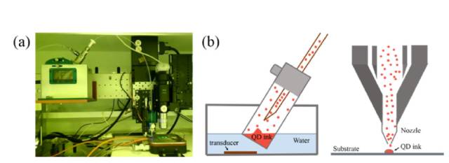 图4 (a)高精度雾化喷涂系统(Aerosol jet technology)及其(b)原理图。